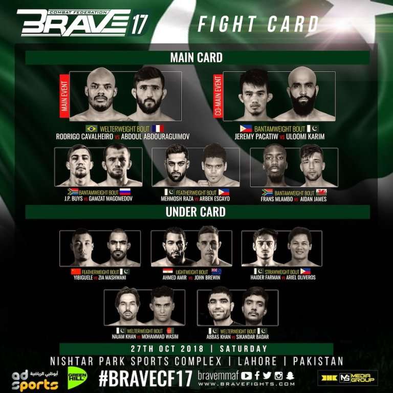 Brave 17 is the first ever international-level Mixed Martial Arts – MMA Tournament in Pakistan. The event is being organized by Brave Combat Federation (BCF) at Nishtar Park Sports Complex in Lahore. Brave CF has formerly organized such events in Bahrain, UAE, Brazil, India, Mexico, Jordan, Indonesia, United Kingdom and Morocco. This is the first time Brave CF has come to Pakistan.